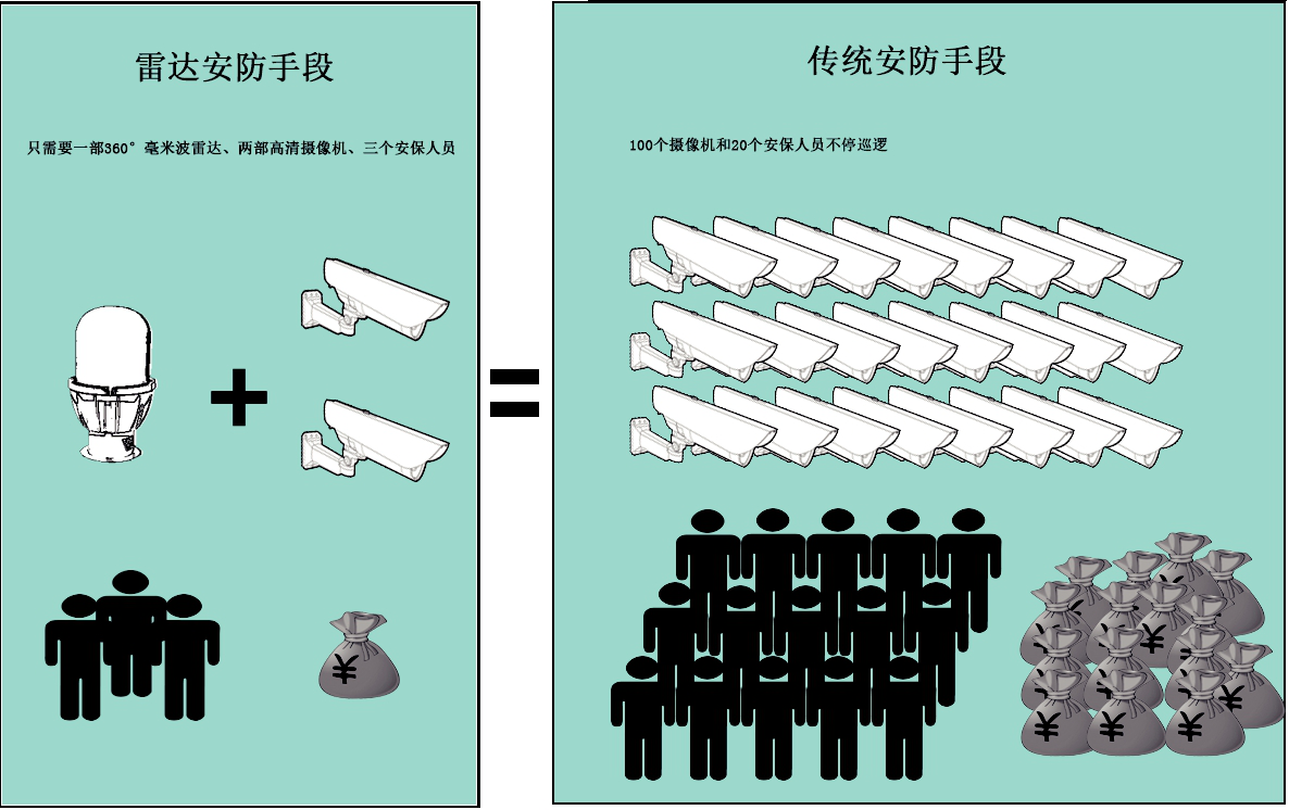 油田重點安保站庫大多地處荒漠戈壁,周圍人煙稀少,站區四周復雜,路口較多,如果完全按照布置傳統攝像機,可能要達到近百臺,并且無法達到1.5km內提前主動預警的效果。雷達預警系統,利用2臺攝像機配合雷達即可達到一般站庫的安保需求。因此,在經濟性上雷達預警系統更有優勢,同時,效果也更佳。